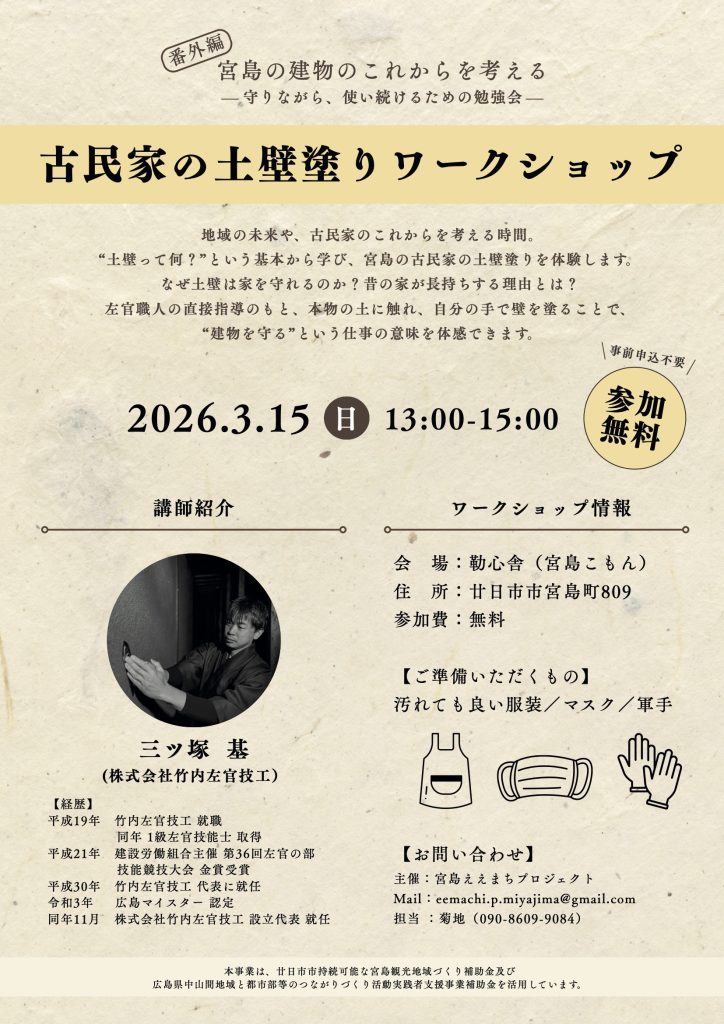 そんな中、土壁の建築物の多い宮島にてワークショップをするお話しをいただきました。