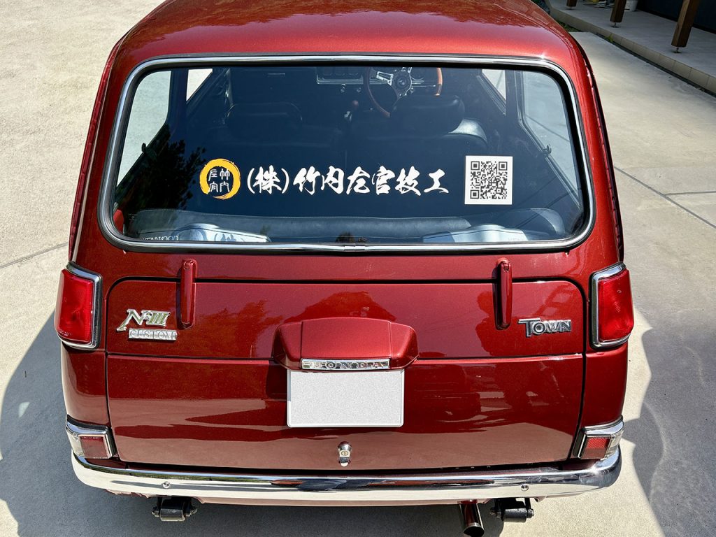 そんな半世紀前の自動車に、先日、リアウインドウに竹内左官技工のステッカーを制作して貼り付けました。