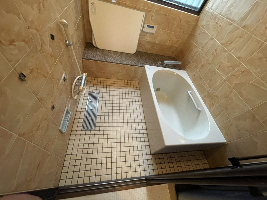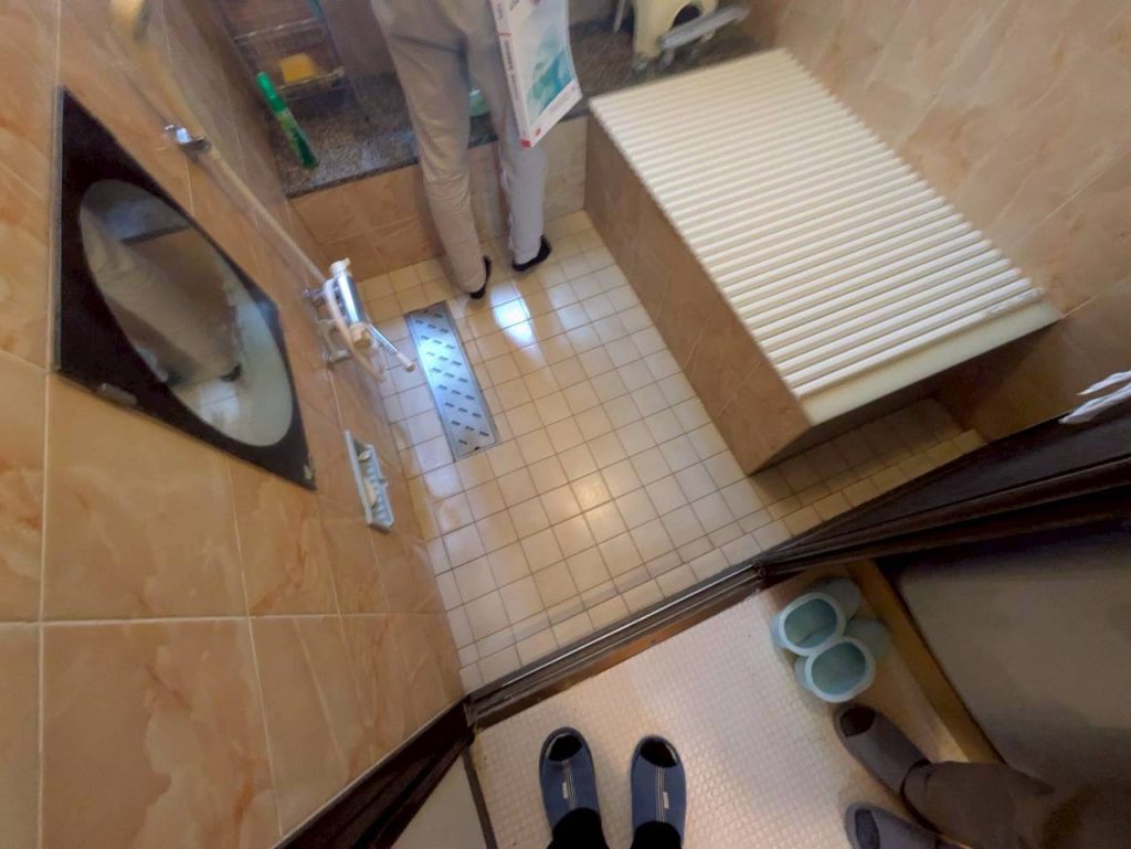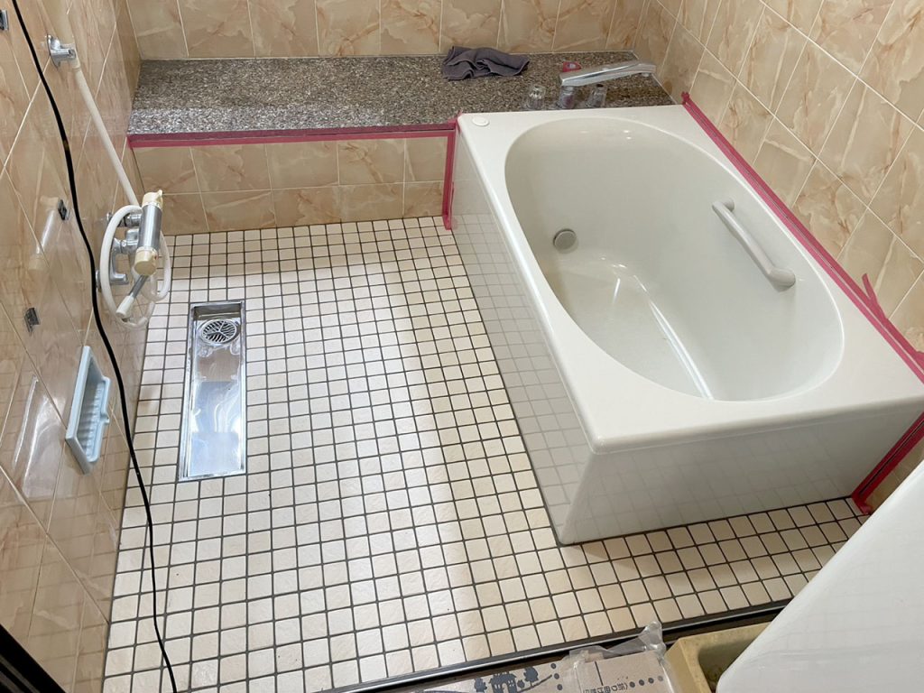 お客様はご高齢ですので、床と浴槽の高さを調整。