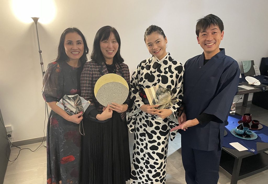 そんな中、特に私の作品と、左官職人としての技術に大変興味を持ってくださったお二人の女性との出会いがありました。写真の中で一番左の方と、三ツ塚の隣にいらっしゃる方です。