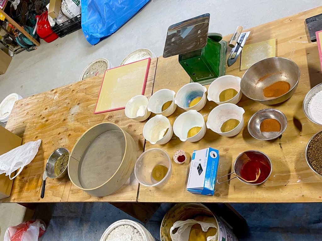 地元のほんとそこら辺りに存在する土、砂、植物を使うのです。